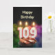 Una torta de cumpleaños con velas. Las velas están compuestas por el número 109, por 109 años. Una tarjeta de cumpleaños para todos.