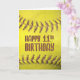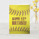 Cierre extremo de un softball amarillo con costura marrón rojiza por 11 años.