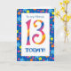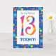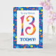 Una tarjeta de cumpleaños 13 brillante y colorida para un amigo, con números a rayas y un borde estelar, de un diseño digital de Judy Adamson. Puede cambiar el mensaje interno si lo desea.