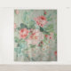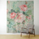 1890 Reproducción de Arte en Tela Vintage Británica con rosas rosadas y margaritas gerber en un fondo verde claro con cinta azul.