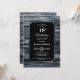 Una rústica invitación a cenar en madera de granero azul y gris con 18 años y el texto blanco resaltado en un fondo negro.