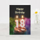 Una torta de cumpleaños con velas. Las velas están compuestas por el número 18, por 18 años. Una tarjeta de cumpleaños para todos.