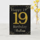 Feliz cumpleaños con el purpurina oro simulado número 19 puesto en negro sólido y enmarcado por diamantes falsos y diamantes de imitación. Feliz cumpleaños y nombre de los destinatarios con una letra en blanco roto. Personalizar con nombre o mensaje.