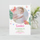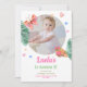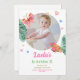 Celebra tu primer cumpleaños con esta invitación elegante y vibrante que incluye una foto y adorables mariposas en tonos rosa y verde. Este diseño llamativo es perfecto para una celebración de primavera o verano.
