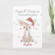 Una dulce tarjeta de nieta de la primera Navidad con un lindo reno usando un sombrero de santa rodeado de copos de nieve de plata. Una preciosa tarjeta de Navidad para regalar a un nieto por sus primeras vacaciones de Navidad. Personalizado cambiando el número de la primera a la segunda o la tercera y nieta a sobrina, ahijada o borrar si no es necesario. Personalice con el nombre del bebé y añada al mensaje interior.