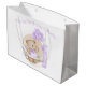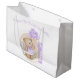 Bolsa de regalo de primer cumpleaños personalizada para un Chica con un oso de peluche lindo y globos en morado. Personaliza fácilmente el nombre.