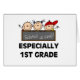La figura niños de tres palillos con sonrisas grandes lleva a cabo a un tablero de escritura que lea la "escuela sea fresco!" ¡y ennegrezca el texto lee "especialmente el 1r grado" en la 1ra escuela primaria es camisetas frescas, tazas, botones, imanes, pegatinas, tarjetas, y otros artículos perfectos para los niños que están en el primer grado y profesores del primer grado!