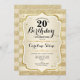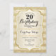 Invitación a la fiesta de cumpleaños número 20. Diseño elegante en oro. Presenta franjas de oro purpurina falsas, letra de guión elegante y confeti. Perfecto para una celebración de cumpleaños glam.