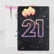 Signo de neón brillante y confeti sobre fondo negro con ramo de globo para invitación de fiesta de 21 años.