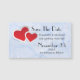 Una boda elegante salva el imán de fecha con un ilustracion de dos corazones de papel juntos - rojo con un borde blanco. Está situado sobre un elegante fondo de mármol azul glacial.