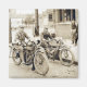 Imán con la imagen de dos hombres montando motocicletas. Esta es una fotografía antigua de mi colección. Ha sido reparado para su disfrute.