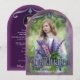 Celebre los logros de su graduado con este anuncio e invitación distintiva. Su estilo elegante, caprichoso y fantasioso se destacará como su graduado. Personalice este diseño de dos (2) fotos con sus datos personales. La palabra "GRADUATE" y el gráfico de floritura de caligrafía tienen un efecto metálico falso de lavanda y azul y sutilmente en relieve. La palabra "graduate" no se puede cambiar, pero el resto del texto de la tarjeta es editable.