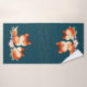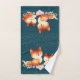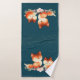 Toalla con un dibujo de 2 zorros rojos. Uno de pie sobre el otro tendido. Dibujado con acuarela. Estrellas de oro falsas decoran el cielo sobre ellas.
