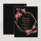 Delante: Una invitación para un elegante fiesta de 30 años. Un fondo negro de moda con un marco geométrico falso dorado. Decorada con flores de color burdeos oscuro y de color rosa acuático, rosas y plumas de estilo boho. Plantillas para un nombre y detalles del fiesta. El nombre está escrito con un guión de estilo con letras a mano, letras de colores dorados. Fondo de color negro.