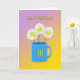 Felices flores de margarita sonrientes en una taza azul brillante, Los 30 años están en amarillo en la taza. Una manera encantadora de desear un feliz cumpleaños número 30.