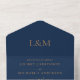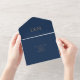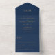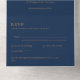 Azul marino (código de color #112B4D) y tipografía dorada, sólo texto, monogramado, minimalista, simple invitación a la boda sin logo que incluye una postal rsvp desgarradora (3 en 1 según las imágenes). El elemento incluye la dirección del remitente, una dirección de devolución y campos de plantilla de texto para la ceremonia del boda y la recepción según desee (edite el texto para adaptarlo a sus necesidades específicas). También puede añadir iniciales de parejas, monograma. Invitación moderna y elegante, económica y acorde a sus necesidades.