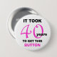 Si estás buscando un regalo de cumpleaños 40 para ella, ¡esto es todo! Este exclusivo regalo de botón de cumpleaños es perfecto para el 40º cumpleaños. El diseño incluye las palabras "tardó 40 años en conseguir este botón". Este botón gracioso es un gran regalo de broma para los 40 años para las mujeres. Palabras y diseño protegidos por el copyright Kathy Henis 9-25-13