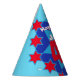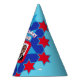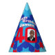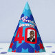 Estrella brillante con estampado personalizado Personalizado foto y gorra de la fiesta de cumpleaños. Ideal para una celebración especial de fiestas de 40 años para niños. Decoración de estrellas de color rojo y azul. También se puede cambiar el color de fondo para elegir el color azul claro. Arte y diseño originales de Sarah Trett. www.sarahtrett.com para www.mylittleeden.com