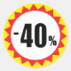 40 por ciento descuento o venta pegatinas en rojo, amarillo y blanco con texto negro "-40%". Estos pegatinas de venta al por menor son excelentes para etiquetar tu mercancía en tu venta al 40%.