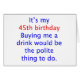 " Es mi 45.o cumpleaños, comprándome que una bebida sería la cosa educada a hacer." El diseño chistoso para el 45 años que ame hacer que la gente ríe y si una bebida libre sale del trato tan sea.