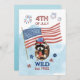 Una bonita y caprichosa tarjeta del 4 de julio con un mapache vestido con una gorra roja y azul inspirada en la bandera estadounidense. El mapache está tomando una bebida patriótica de una lata con paja, ambientada en un fondo azul claro con fuegos artificiales y una bandera norteamericana ondeando. El texto en negrita dice "4 de julio" en la parte superior y "Salvaje pero libre" en la parte inferior. Un alegre diseño para celebrar el Día de la Independencia con encanto y personalidad.