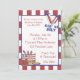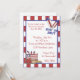 Invitación patriótica con frontera roja, blanca y azul, bandera estadounidense, comida y fuegos artificiales.