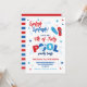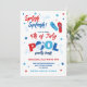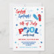 A fun 4th of July Pool Party Invitation in a red and blue colour scheme with a striped design at the back. Perfect for a patriotic Summer celebration!