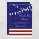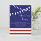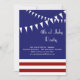 Una divertida invitación roja, blanca y azul el 4 de julio con banderas y rayas.