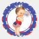 Pegatina de Baby Shower del 4 de julio con niño pequeño ventilado sosteniendo brillo en rojo, blanco y azul con pañal de bandera estadounidense