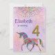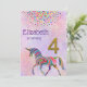 Esta invitación del unicornio del arco iris de la diversión en rosa es perfecta para el cuarto cumpleaños de su hija. Ella adorará simplemente la combinación de confeti arco iris-coloreado y de su edad en purpurina brillante del oro. El torneado de 4 es una gran cosa y para el chica del cumpleaños, ella quiere su invitación de encargo a ser algo especial. Este unicornio mágico del arco iris hará a su fiesta de cumpleaños inolvidable y sus amigos amarán esto, también. Fácil modificar para requisitos particulares en el frente y la parte posterior con sus propios detalles. Cambie el estilo de fuente y coloréelo si usted desea.