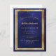Una moderna y moderna tarjeta de invitación para fiestas de 50 años para hombres, hombres, hombres. Un fondo azul oscuro, azul marino. El color azul es desigual. Con un marco de oro falso y un confetti dorado rociado, letras de colores dorados. Plantillas para la información de su fiesta. Atrás: diseño simple de postales.