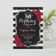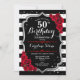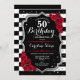 50.ª Invitación de cumpleaños Elegante diseño rojo blanco negro con falso purpurina. Rayas blancas y negras con rosas rojas. Perfecto para una elegante fiesta de cumpleaños.