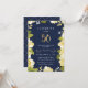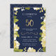 Esta elegante y elegante fiesta de cumpleaños número 50 cuenta con un borde floral ilustrado y el número "50" en oro. El fondo es de color azul marino, pero se puede personalizar según el color que elija. La parte posterior de la invitación incluye un patrón de quatrefoil dorado con un fondo azul que también se puede intercambiar. El texto es el personalizable para su evento especial de cumpleaños.