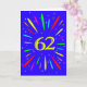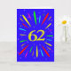 ¡Una explosiva tarjeta de cumpleaños número 62! Qué manera maravillosa de enviar saludos de cumpleaños. El número 62 en amarillo brillante con una explosión de colores brillantes y estrellas.