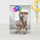 Un gato de tabby de aspecto lúgubre sobre una mecedora de madera y que llega a un globo de colores durante 68 años. Se puede cambiar el número de edad.