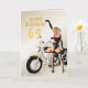 Un chica con una motocicleta apuntando al mensaje Feliz Cumpleaños. ¡Una gran carta para el hombre que ama sus bicicletas!