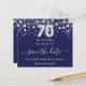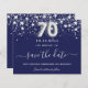 Una chica y de moda Salven la Fecha para una fiesta de cumpleaños número 70. Un fondo azul marino. Decorada con estrellas falsas de plata. El texto: Save the Date se escribe con un gran guión de estilo escrito a mano. El número 70 se escribe con un tipo de letra de estilo globo.