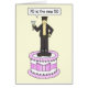 Un hombre personalizado vestido con un traje de cuero colocado sobre una gran tarta que dice "70 es el nuevo 50". La imagen tiene un fondo de color limón.