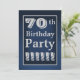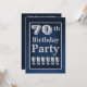 Esta invitación preciosa de la fiesta de cumpleaños es perfecta para las fiestas de cumpleaños de los adultos. La invitación es azul marino y se descolora abajo a azules marinos más ligeros hacia la parte inferior y el centro. En el centro está un área rectangular con el ajuste gris perla y el interior es texto en fuente gris. El texto se puede todos modificar para requisitos particulares para adaptarse a sus necesidades. El dorso es azul marino sólido con el texto en fuente gris. El texto es otra vez todo el personalizable. Esta invitación se ha diseñado para el uso como 70.a invitación de la fiesta de cumpleaños, no obstante modificar la invitación para requisitos particulares deja flexible para las aplicaciones múltiples. Perfeccione para las fiestas de cumpleaños de todas las edades, acontecimientos corporativos, etc.