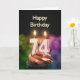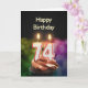 Una torta de cumpleaños con velas. Las velas están compuestas por el número 74, por 74 años. Una tarjeta de cumpleaños para todos.