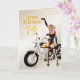 Un chica con una motocicleta apuntando al mensaje Feliz Cumpleaños. ¡Una gran carta para el hombre que ama sus bicicletas!