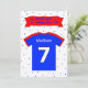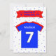 Esta divertida invitación a la fiesta de cumpleaños número 7 está lista para tu texto personalizado. La parte delantera de la tarjeta incluye un gran cartel de cumpleaños rojo con el mensaje "Ven a mi fiesta de cumpleaños número 7". Hay una camisa de estilo deportivo roja y azul, con un gran número blanco 7 y espacio para el nombre del niño. En el reverso de la tarjeta puede introducir los detalles del fiesta.