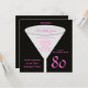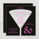 Esta invitación a la fiesta de cumpleaños número 80 fue hecha para mujeres pues presenta los colores negro y rosa caliente. Un vaso es el punto focal con el nombre del honor de cumpleaños y los detalles de la fiesta de cumpleaños dentro. El número 80 aparece en la parte inferior derecha en rosa caliente. Esta invitación a la fiesta de cumpleaños número 80 es un diseño muy moderno para ella. Copyright henishouseofpaper