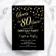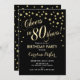 80.ª invitación a la fiesta de cumpleaños. Elegante diseño en falso oro purpurina y negro. Presenta un diseño elegante de tipo de letra y letra de guión. ¡Saludos a 80 años! Perfecto para la celebración del Día del Hito de Mujeres o Hombres