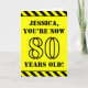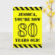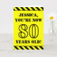 El frente de este diseño de tarjeta de felicitación de cumpleaños llamativo y audaz presenta un nombre editable y el mensaje "¡AHORA TIENES 80 AÑOS!" en texto con aspecto de plantilla negra sobre un fondo de color amarillo. También hay un patrón de rayas negras y amarillas llamativo en los bordes superior e inferior del frente. El interior presenta un mensaje de felicitación de cumpleaños editable, o quizás podría borrarse y dejarse en blanco si se desea escribir un mensaje a mano. Una tarjeta de cumpleaños como esta podría ser una forma divertida de enviar buenos deseos a alguien que está celebrando su cumpleaños número ochenta. [~Z0000413]