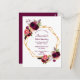 Al frente: Una invitación para una elegante fiesta de cumpleaños número 90. Un fondo blanco moda con un marco geométrico falso dorado. Decorada con flores de color burdeos oscuro y de color rosa acuático, rosas y plumas de estilo boho. Plantillas para un nombre y detalles del fiesta. El nombre está escrito con un guión de estilo con letras a mano, letras de color burdeos. Fondo: fondo de color burdeos.