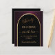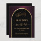 Una tarjeta Save the Date para una fiesta de cumpleaños número 90. Un fondo negro y burdeos, decorado con un arco dorado falso. Personalice y agregue una fecha y su nombre. El texto: Ninety y Save the Date se escribe con un gran guión a la moda de estilo con letras a mano. 1 hoja = 1 guardar la fecha de borde impreso en borde.