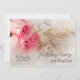 Una hermosa y delicada imagen de un rosa en tonos suaves de color rosa. en el fondo hay una hilera de perlas. El conjunto se suaviza con una pluma tan delicada. Una encantadora invitación para la fiesta de cumpleaños. Cambiar la espalda a los detalles de su propio fiesta