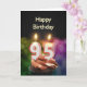 Una torta de cumpleaños con velas. Las velas están compuestas por el número 95, por 95 años. Una tarjeta de cumpleaños para todos.