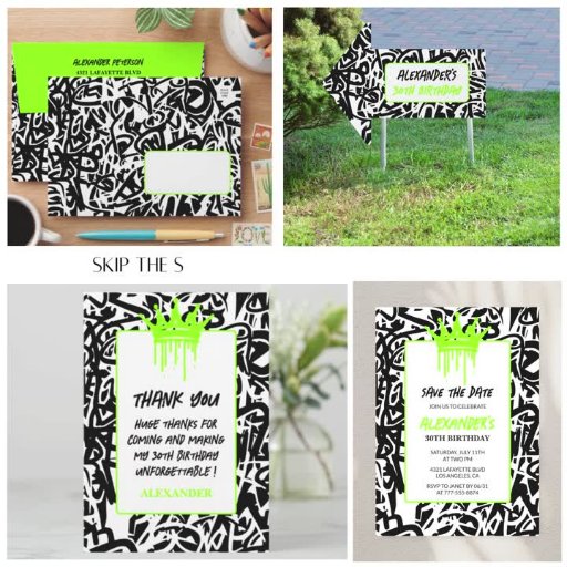 9.ª invitación al cumpleaños Niño Fiesta Graffiti Crown negro moderno